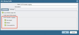 - Enable HTTP Header Logging. To do this, go to Objects | Security Profiles | Settings and enable User-Agent, Referer, and X-Forwaded-For checkboxes under HTTP Header. For more details, see How to Enable HTTP Header Logging and Track URLs Accessed by Users.